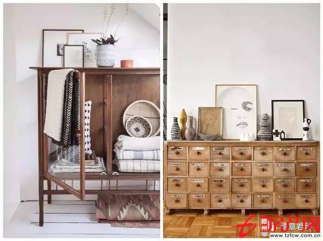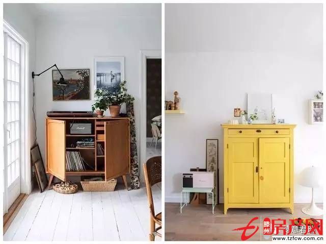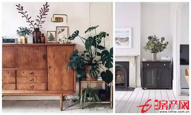 柜子上和柜子邊的搭配也可以起到很好的裝飾作用,讓這一片小區域豐富起來。但是要注意色系和風格的配合,不要堆放過多雜物。