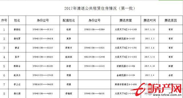 依據《滕州市公共租賃住房配租管理實施細則(試行)》(滕政發【2013】98號)的規定,現將2017年(第一批)公共租賃住房清退情況予以公告。