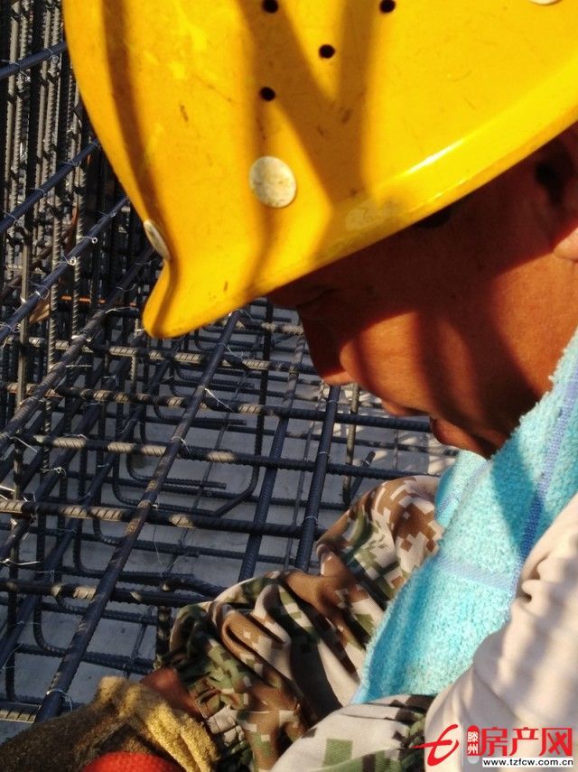 為保證設計受力,工人們們嚴格按照圖紙設計的標準對主筋、板筋、柱筋、箍筋橫豎交叉的地方綁上匝絲綁扎、固定。工作中難免要碰到這些滾燙的鋼筋,由鋼筋匝成的鋼筋柱和鋼筋網不斷散發著熱度,即便穿上長袖長褲保護皮膚不曬傷,薄薄的衣服也根本擋不住熱浪。